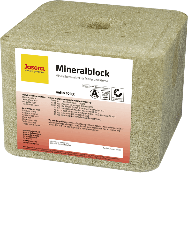 Lisaks naatrium- ja kloori elektrolüütidele varustab JOSERA Mineralblock teie karjatatavaid loomi kõigi oluliste mineraalide ja mikroelementidega. Lai kaltsiumi ja fosfori suhe aitab kompenseerida teiste söödakomponentide liigset fosforisisaldust. Uuendusliku lõhnakaitsekile abil on soolalakk kaitstud väliste mõjude eest ja püsib alati värskena.